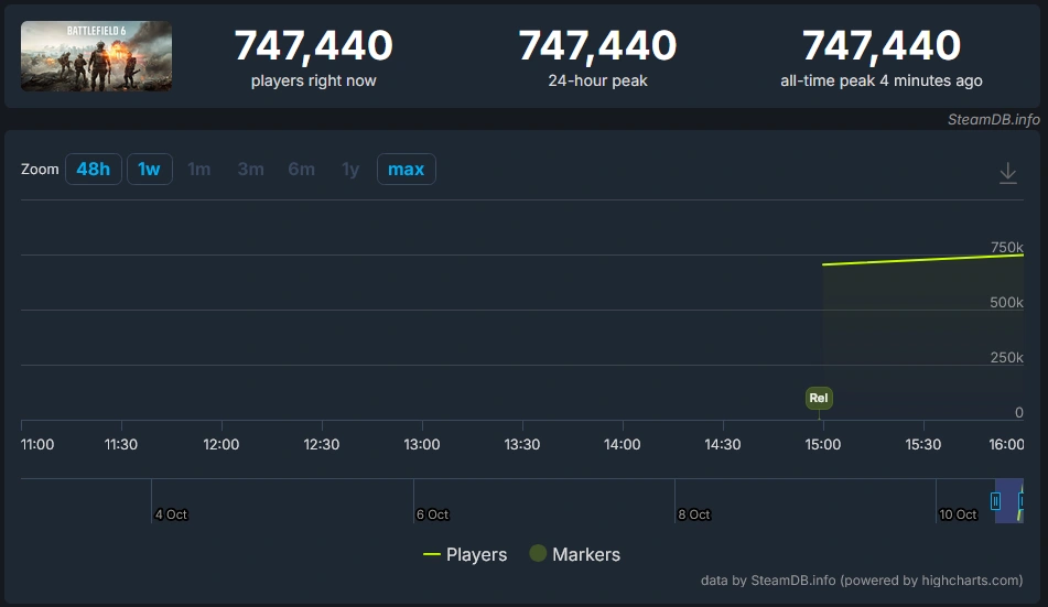 Las cifras hablan por sí solas. En menos de dos horas de su lanzamiento, Battlefield 6 ya ha superado los 700 000 jugadores concurrentes en Steam y sigue subiendo, como podemos comprobar en SteamDB. Además, esto es solo las cifras de una única tienda en PC y no da, ni mucho menos, una imagen de cuál es la acogida global de Battlefield 6, porque no hay datos de la aplicación de EA, ni PlayStation ni Xbox…