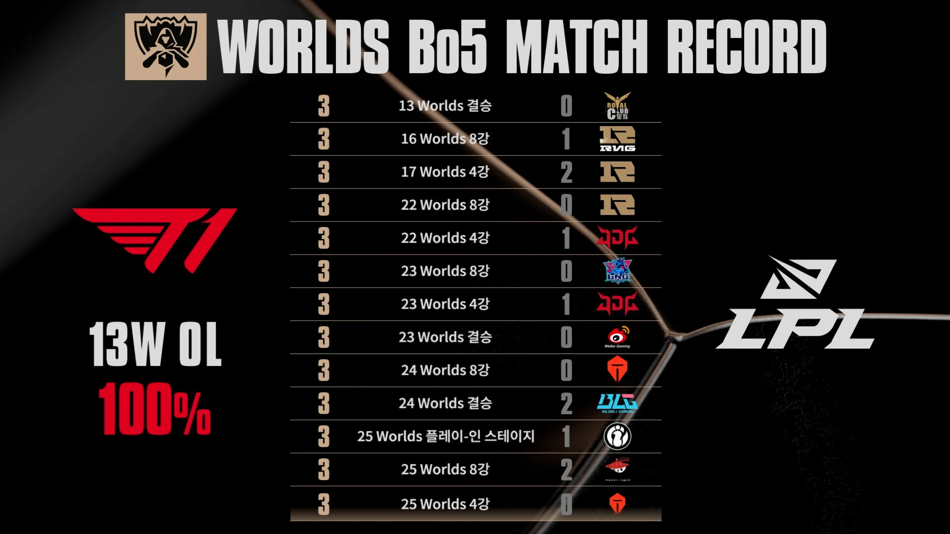 T1 venía como el seed 4 de la LCK, tuvo que entrar desde el Play-In e hizo una fase suiza terrible. Da igual cómo llegue T1 a los playoffs: si lo consiguen siempre llegan al top 4 o a la final y dan auténticas palizas. De hecho, siguen aumentando su récord contra la LPL.